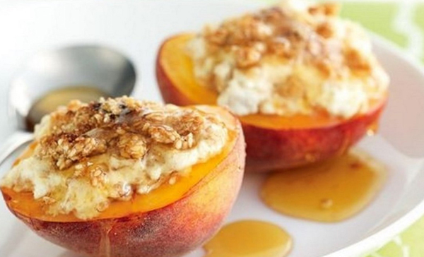 4 just-ripe peaches, halved, stone removed; 1 orange zested and retain ½ the juice; 200g fresh ricotta cheese; 1tbspn icing sugar; pinch ground cinnamon; 100g toasted muesli – slightly crushed or crushed ginger nut biscuits; 4 tbspn warm runny honey to serve.