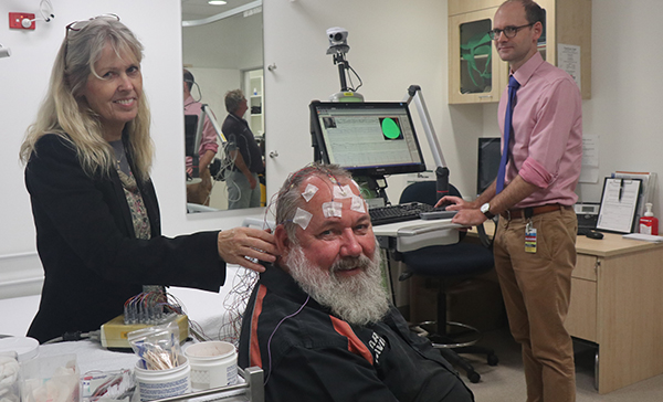Sponsor Wayne Leonard was excited to try out the current EEG equipment being used by the small but hard-working neurology team at Cairns Hospital. Mr Leonard laughed that he had never experienced an EEG before, but he was relieved to see that all his brain activity was normal.